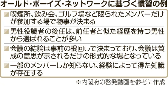 オールド・ボーイズ・ネットワーク(OBN)という言葉がある。企業の重要事項や人事が「たばこ部屋や飲み会で決まる」など、組織に根強くある男性中心の閉鎖的な人脈や企業風土を指す。女性や若手の活躍を阻害し、...